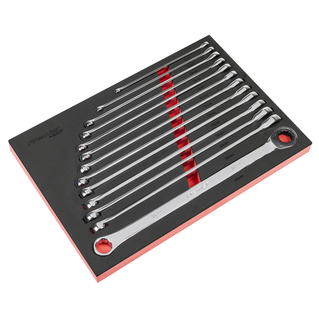 Manufactured from hardened and tempered Chrome Vanadium steel with a fully polished mirror finish. 12-Point ratchet/fixed WallDrive¨ ring ends. 72-Tooth ratchet requires only 5¡ rotation to pick up the next tooth. WallDrive¨ rings grip the wall, not the corners, giving up to 30% more torque. Supplied in EVA foam storage tray.