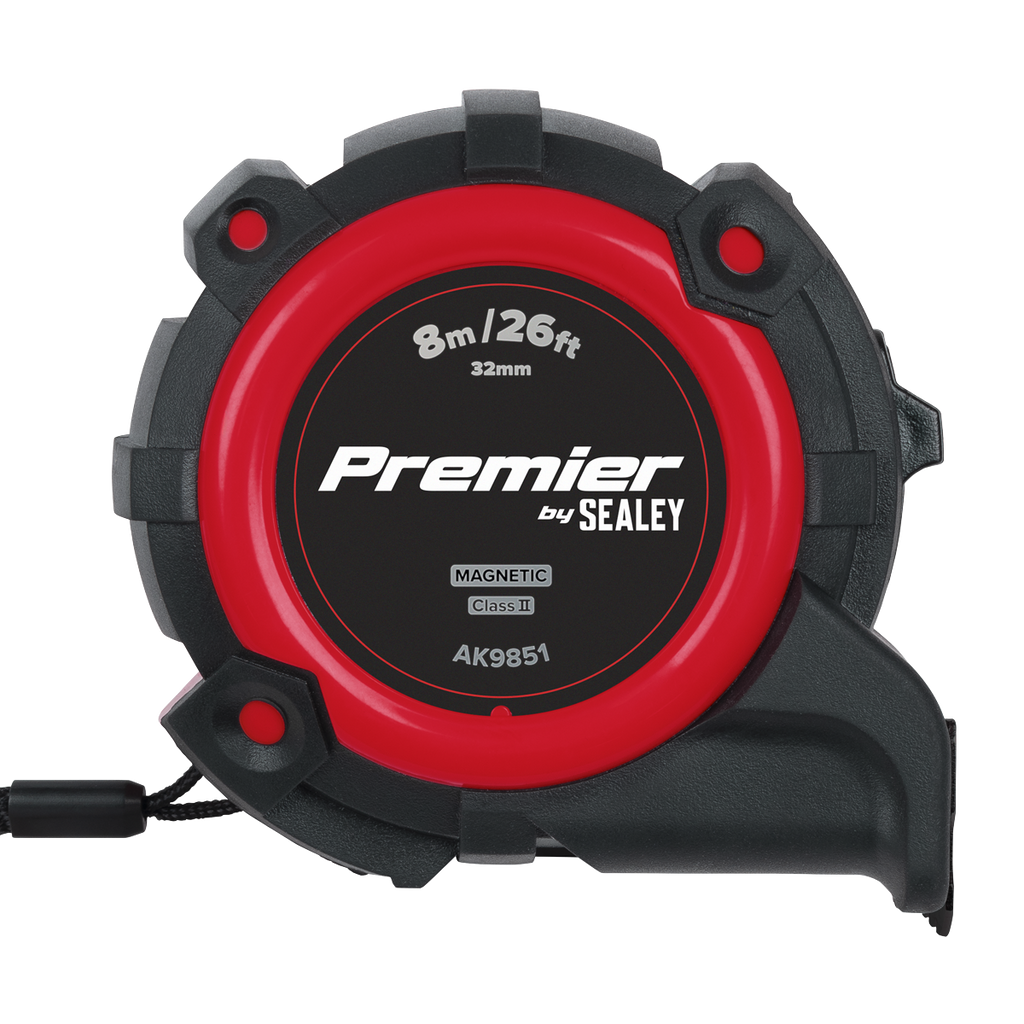 Durable rubberised ABS body designed for rigorous work. Extra-wide 32mm nylon wrapped blade maximizing strength over longer measurements. Double edged magnetic end hook designed to grab on top or bottom for versatility. Double-sided blade with Metric and Imperial scales. Strong rewind mechanism with a slide button lock. Supplied with belt clip and wrist strap. Manufactured to class II standards.