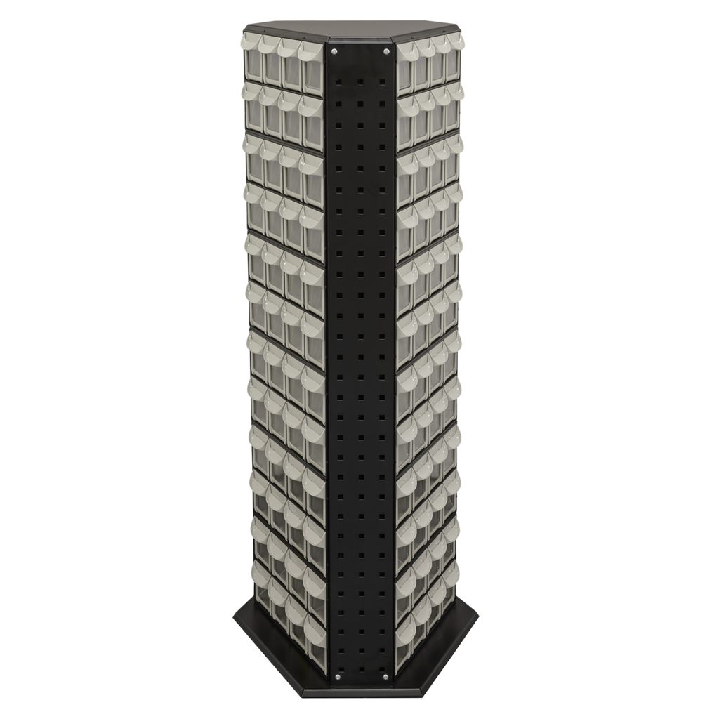 - FREESTANDING - Freestanding rotating parts storage system featuring 144 small parts bins.