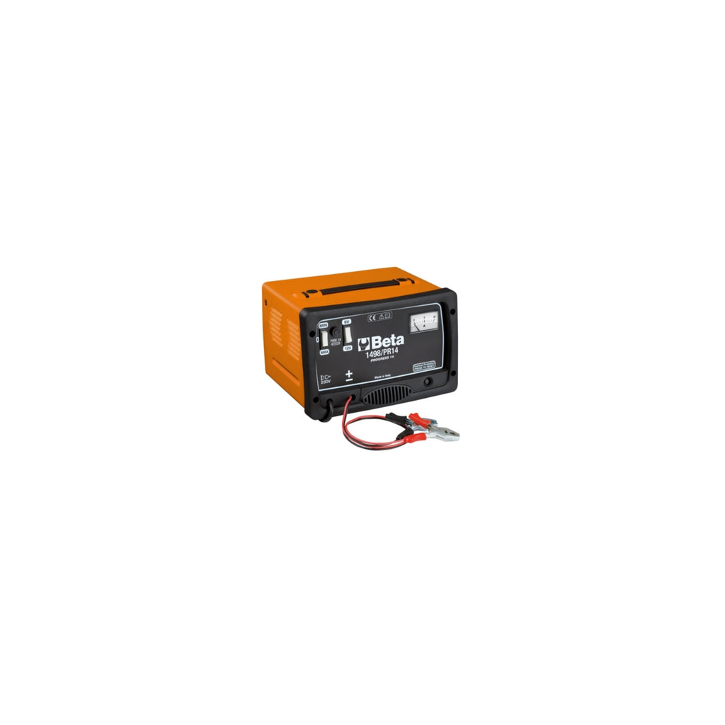 The Beta Tools 1498/PR14 Conventional Battery Charger is an indispensable tool for professionals in the automotive and repair industries. Designed to charge lead-acid storage batteries, this charger operates at 6/12V and is equipped with high-quality internal transformers. It combines tradition with innovation, ensuring safe and reliable performance. The charger features voltage/current selectors, built-in ammeters, and automatic thermal overload and reverse polarity protectors, making it an excellent choice for those who demand efficiency and safety in their work. With a power supply of 230 V and a power output of 140 W, the Beta Tools 1498/PR14 is engineered to meet the rigorous demands of professional environments.