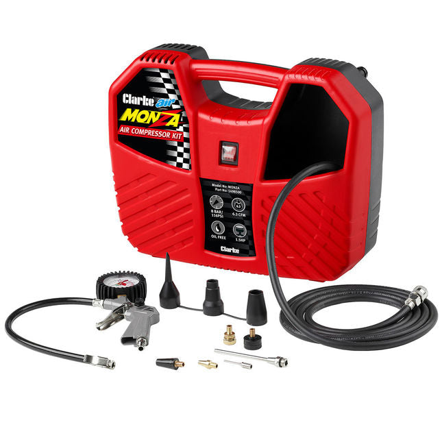 The Clarke Monza is a convenient, portable and lightweight compressor kit compatible with air tools such as blow-out pistols or spray guns. Using the range of supplied adaptors, the Monza allows you to quickly perform a wide range of compressed air jobs in a home, garden or garage environment. The adaptors can be quickly and easily changed via the quick-release coupler and thanks to the compressor's small size, small footprint and integrated carry handle the Monza compressor kit can be easily tr