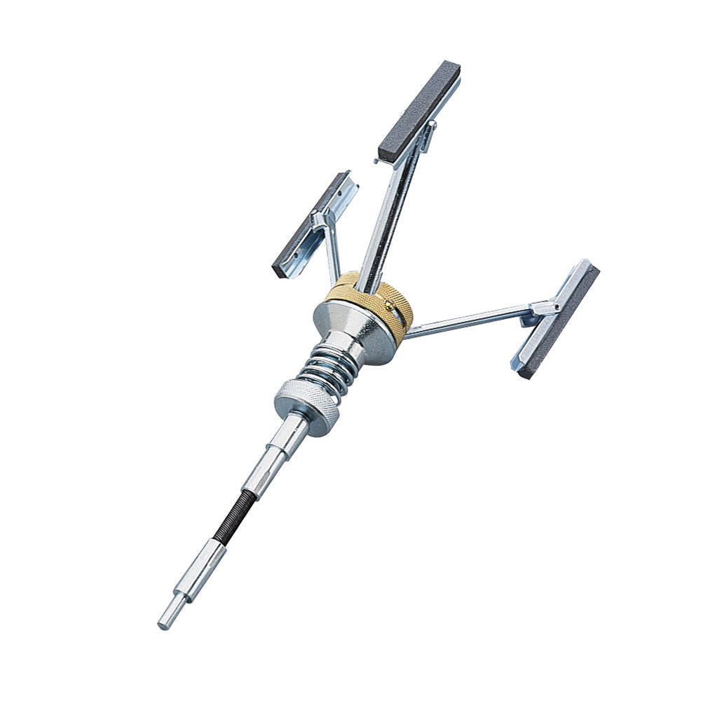 A power drill will drive this three legged tool via its integral flexible shaft to remove heat glaze & carbon deposits from cylinder bores up to 180mm diameter. The tension of the medium grade cutting stones can be adjusted to obtain the desired finish.