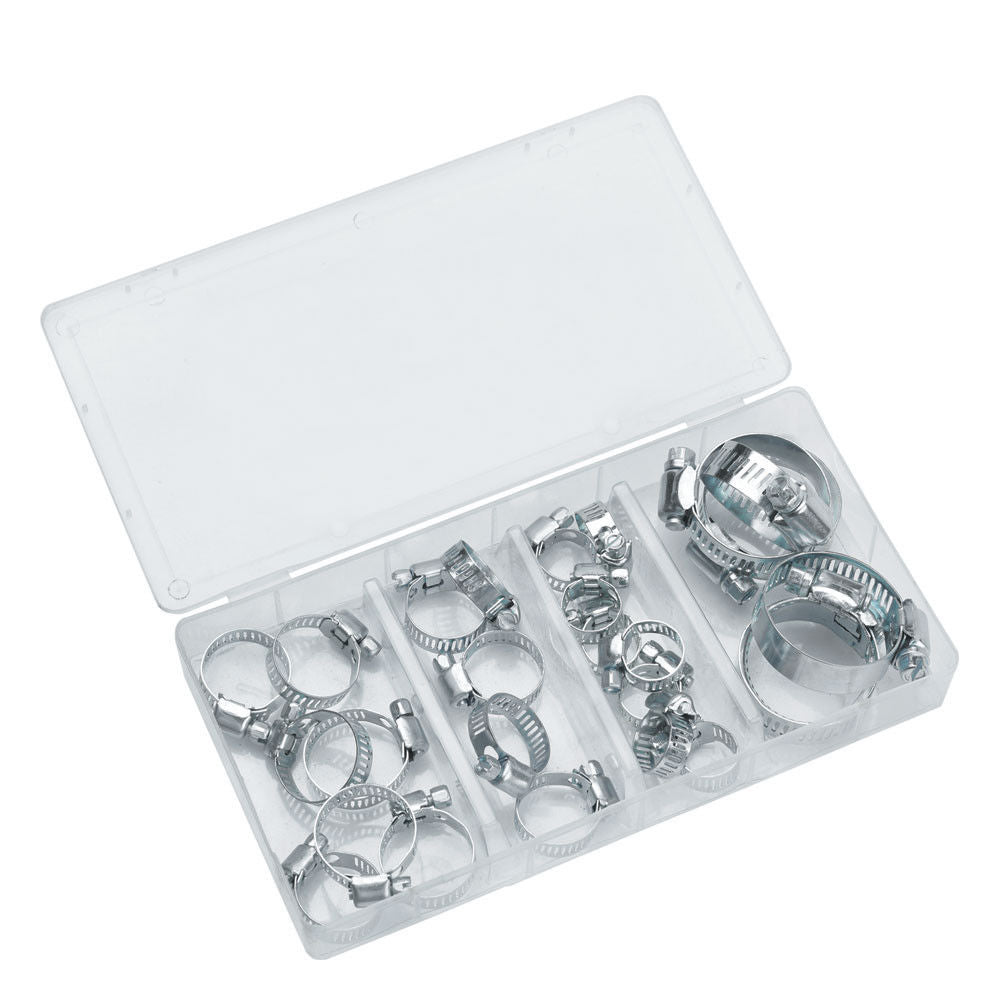 26 piece assorted hose clip set for securing hoses around pipes and for automotive use. Worm gear type screw & thread and zinc plated for corrosion resistance.