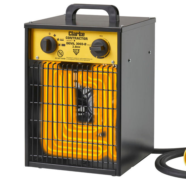 The Clarke DEVIL 3003-B is an effective yet efficient heater for the trade. Utilising a lightweight and portable design, it comes supplied fitted with a heavy duty input lead and 110V plug. Ideal as a secondary heat source for heating well insulated indoor areas on site. **Please note, glow in image is for illustrative purposes only.