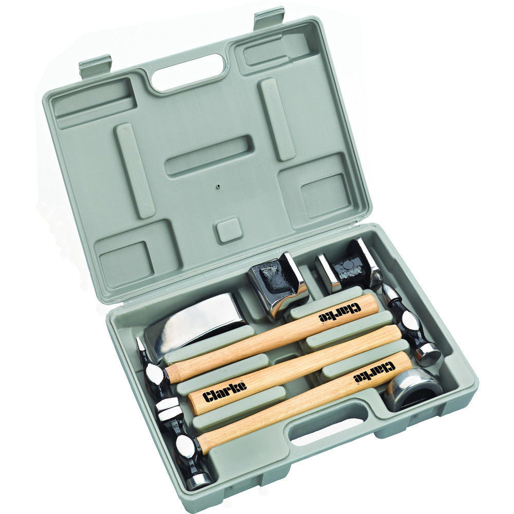 A comprehensive 7 piece panel beating set, complete with various hammers and dollyies for a variety of jobs. Supplied in a tough moulded case and featuring hickory shafts for strength, durability and more comfortable grip.