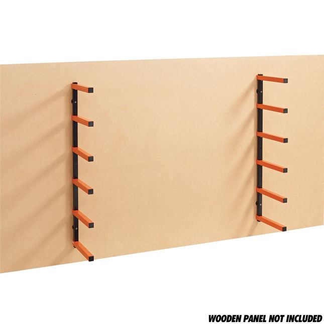 This simple to install wall mounted rack includes two uprights, each with 6 support arms. Providing tidy storage of wood, metal, plastic etc. of varying lengths and widths.