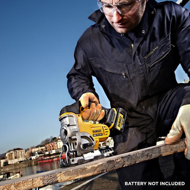 This 18V XR Jigsaw has an all metal, lever-action keyless blade clamp designed for quick and easy blade changes and an all-metal keyless shoe bevel with four detents at 0°, 15°, 30°, and 45° to make bevel adjustments easy. The variable-speed trigger provides up to 3,000 strokes per minute to easily adjust speeds during cutting and 4-position orbital action for wood cutting. A removable shoe cover helps protect materials from scratches and the dust blower helps users see where they're cutting. Bare unit, batteries and charger sold separately.