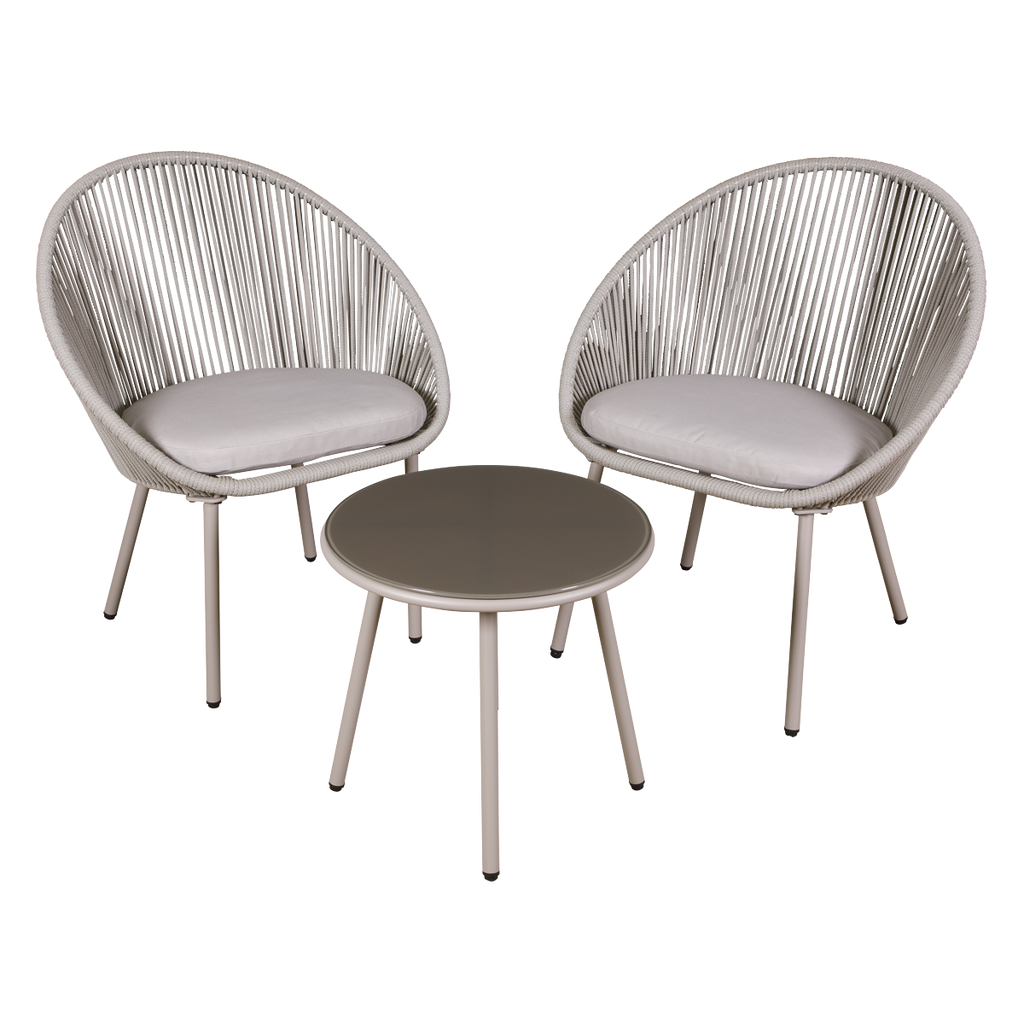 Frame constructed from powder coated steel. Contemporary design with Diameter 8mm round weather-resistant Textilene rope. Powder coated steel table with 5mm shatterproof tempered glass top. Supplied with 5cm thick seat cushions. Set includes two chairs and tempered glass top table. Some simple assembly is required. Disclaimer: Colours may slightly vary due to lighting conditions.