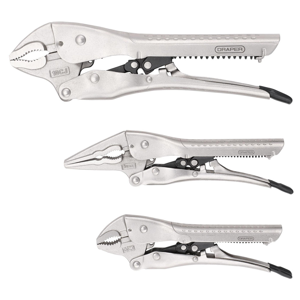 These multi-purpose self-locking pliers automatically adjust their jaws to the task while applying constant pressure. They are particularly useful in confined spaces. The jaws are forged from chrome vanadium steel and nickel plated for durability, these pliers are designed for easy one-handed operation. The release handle is PVC dipped for better grip. The set includes two curved jaw auto locking pliers with wire cutters - 175mm and 250mm (with opening capacities of 20mm and 25mm, respectively), as well as 200mm long nose jaw auto locking pliers with a wire cutter (with a 30mm opening capacity).
