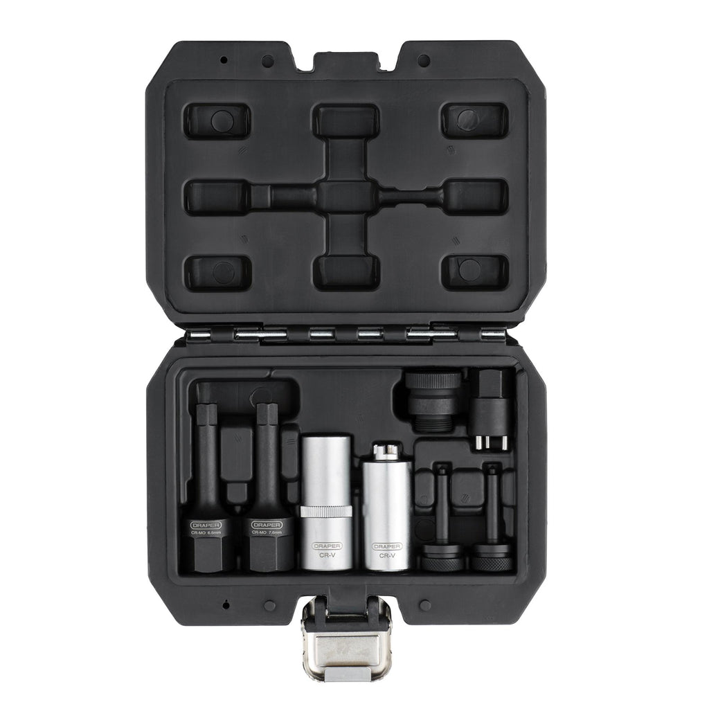 This common rail (CR) diesel injector repair kit includes tools for loosening and removing internal fixings from Bosch, Denso and Siemens injectors. It includes injector ball valve lapping tools and a guide. The tools are made from chrome molybdenum steel with a black phosphate finish, and chrome vanadium steel with a satin chrome finish. The set includes an internal fixing removal tool for Siemens and Denso CR injectors, plus an eight-sided socket for Bosch CR injectors. Supplied in a sturdy plastic storage case.