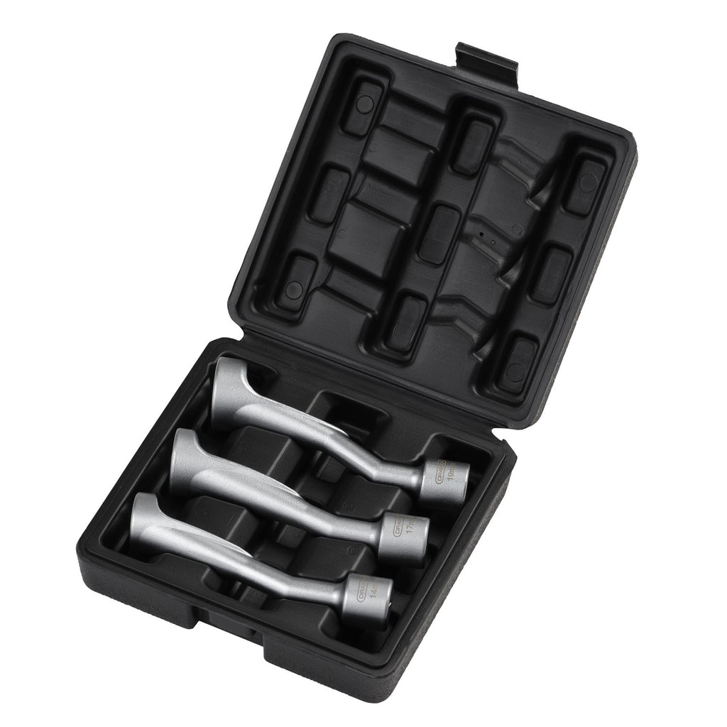 This set of 12-point sockets is specially designed for tightening and loosening the injector line nuts on injection pumps and fuel injectors. Made from chrome molybdenum with a satin chrome finish for corrosion resistance. The set includes 14, 17, 19mm and it comes in a sturdy plastic storage case.