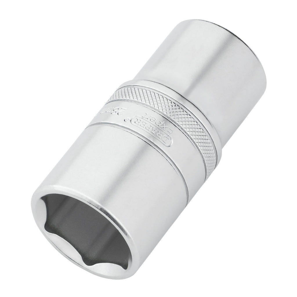 These Draper Expert Hi-TORQ® 6-point deep sockets are made from hardened chrome vanadium steel and have a chrome plated micro-satin finish for corrosion protection. Each socket includes a knurled ring for enhanced grip.