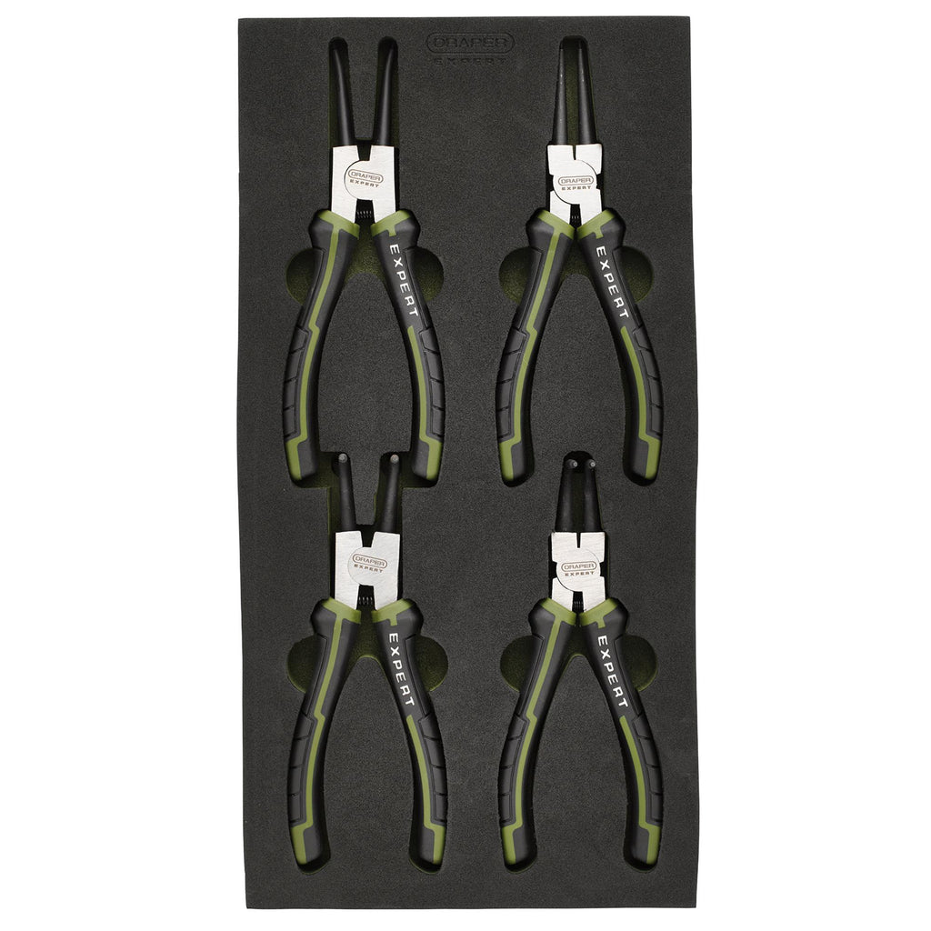 This circlip pliers set is constructed from chrome vanadium steel, ensuring durability and reliability. The spring-loaded handles automatically open the pliers after each compression, while the precision-machined jaws improve grip. The heads are electrophoretically plated for superior corrosion resistance. Additionally, the soft grip handles provide improved comfort and a better grip. The set includes pairs of 180mm straight and bent circlip pliers, both external and internal inside an EVA foam storage tray (370 x 185 x 35mm).