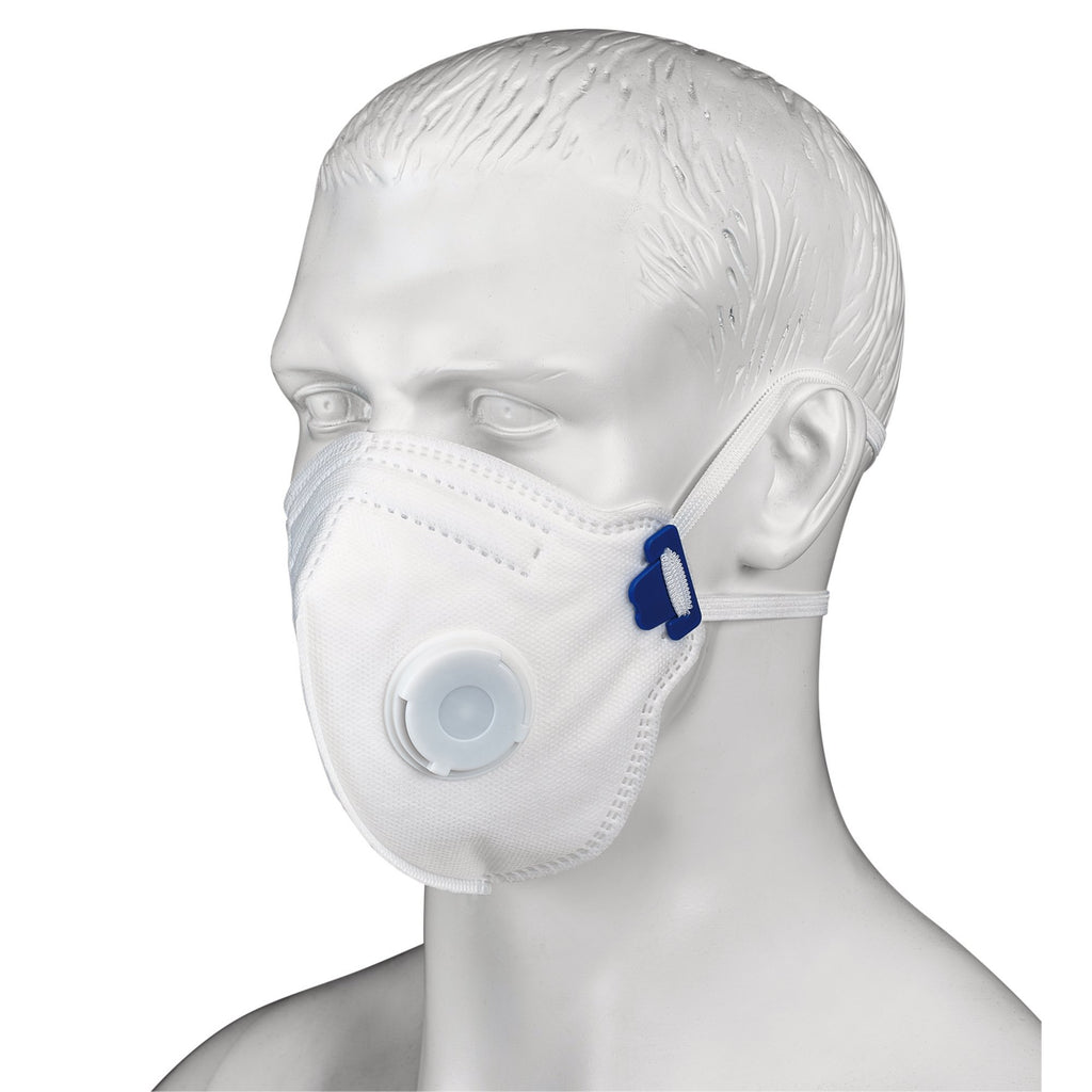 This disposable dust mask offers the highest protection against very fine dusts, fibres, aqueous mists and oil-based mists. The integrated valve offers low breathing resistance and comfort over long periods. The elasticated and adjustable nose clip ensures a contoured fit, making it compatible with eyewear and reducing fogging. It can be folded vertically, which makes it easy to store. The mask is maintenance-free and comes in a box of 10.