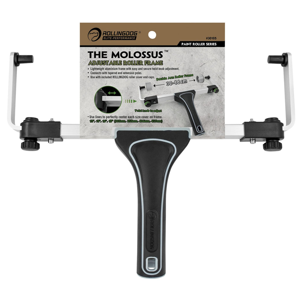 This adjustable roller frame from Rollingdog fits 12-18" roller sleeves. Made from lightweight aluminium with easy and secure twist knob adjustment. Connects to Secure-Click™ tapered fit extension poles. Includes two Molossus roller cover end caps.