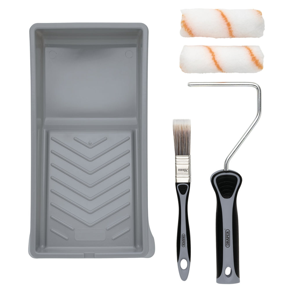 2 x 4" Medium pile polyester roller sleeves 1 x 4" Zinc plated steel roller frame 1 x 4" Roller tray 1 x 20mm Paint brush