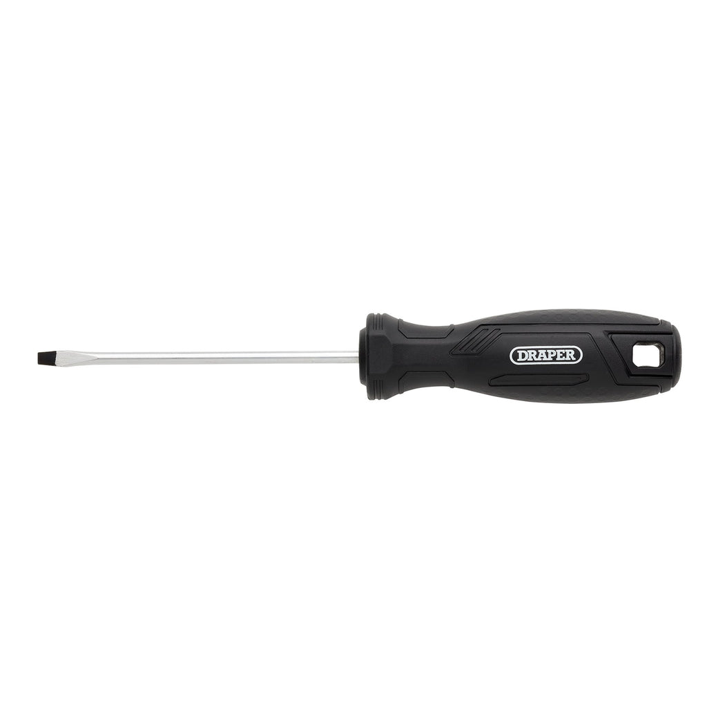 These slotted screwdrivers have a hardened chrome vanadium steel round blade with chrome plating for corrosion protection. The larger sizes have a hex bolster so they can be turned with a spanner for extra torque. The blade tip is magnetic to hold the screw in place, making it easier to deliver more accurate force and precise fastening and loosening. The tip also has a black phosphate coating for added durability. Available as flared and parallel in some sizes. Comfortable moulded grip handle made from high impact resistant plastic, which is easy to clean and resistant to oils and chemicals. Its shape helps ensure the screwdriver does not roll off flat surfaces. There is a hang hole integrated into the handle for convenient storage.