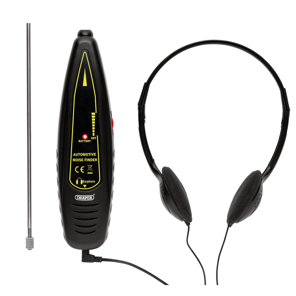 This electronic stethoscope is designed to quickly and easily identify the source of automotive noises and vibrations. It is particularly useful for diagnosing issues in engines, gearboxes, and bearings in noisy environments. Featuring an extra-long probe, it is ideal for use in tight spaces. The volume control and headphones provide clear audio results. It operates on a 9V battery (sold separately) and includes a battery indicator that signals when it is time to replace the battery.