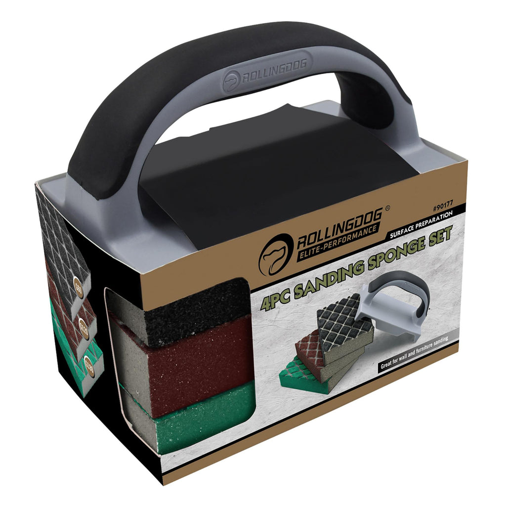 This sanding sponge set from Rollingdog includes an ergonomic rubber grip sanding handle designed to fit standard sanding sponges (125 x 70 x 24mm). The set is equipped with three flexible sanding sponges made of aluminium oxide with an anti-clogging pattern. Prepare surfaces from rough to smooth using 60, 120, 180G.