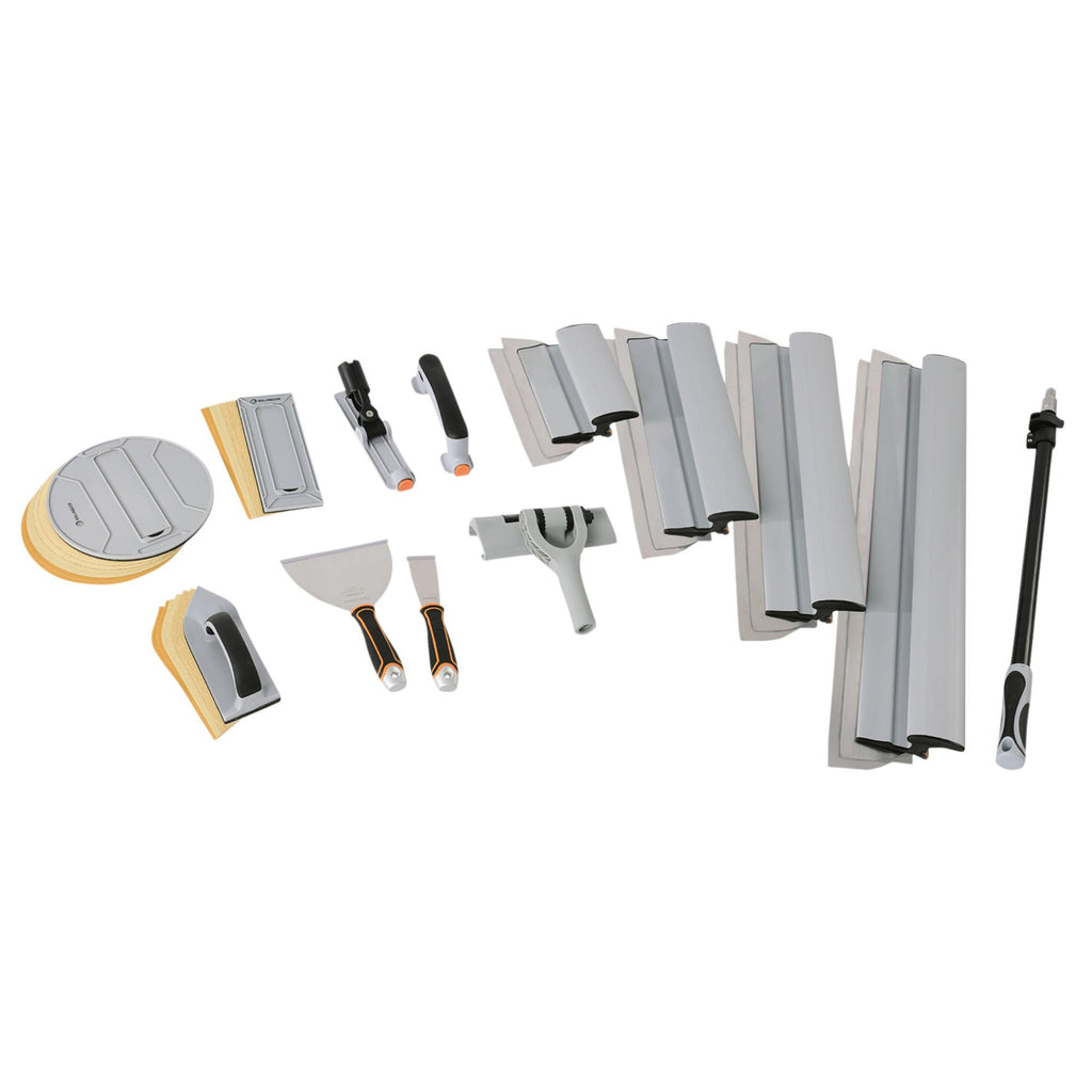 1 x 220mm Surfex radial wall sander With accessories - 1 x Extension pole, 6 x Aluminium sandpaper (2 x 80G, 2 x 120G, 2 x 240G) 1 x Rectangular wall sander - 225 x 85mm With accessories - 6 x Aluminium oxide sandpaper ( 2 x 80G, 120G, 240G) 1 x Pointed detail sander - 185 x 75 x 65mm With accessories - 6 x Aluminium oxide sandpaper ( 2 x 80G, 2 x 120G, 2 x 240G) 8 x Skimming blades - 2 x 250, 2 x 450, 2 x 600, 2 x 800mm 1 x Pro-Angle extension pole adaptor with 180 Degree angle adjustment 1 x Quick-Fire telescoping extension pole 3 x PVC handle with flexible removable blade 2 x Putty knives - 1.5, 6"