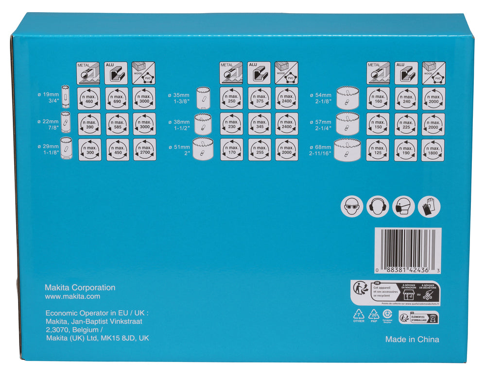 Kit Contains: Holesaw sizes 19, 22, 29, 35, 38, 51, 54, 57, 68mm, plus x2 Arbor and x1 eject spring.