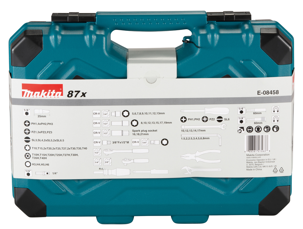 Makita E-08458 Set of 87 Pieces DIY Assembly Hand Tools Complete set of tools for workshops, assembly, construction vehicles, DIY enthusiasts and much more. The tools are made of robust chrome vanadium steel and have a long service life. The accessories can be found quickly and stored safely in the well-ordered case. Additional bumpers on the case allow for frequent and regular use. With additional compartment for additional accessories.