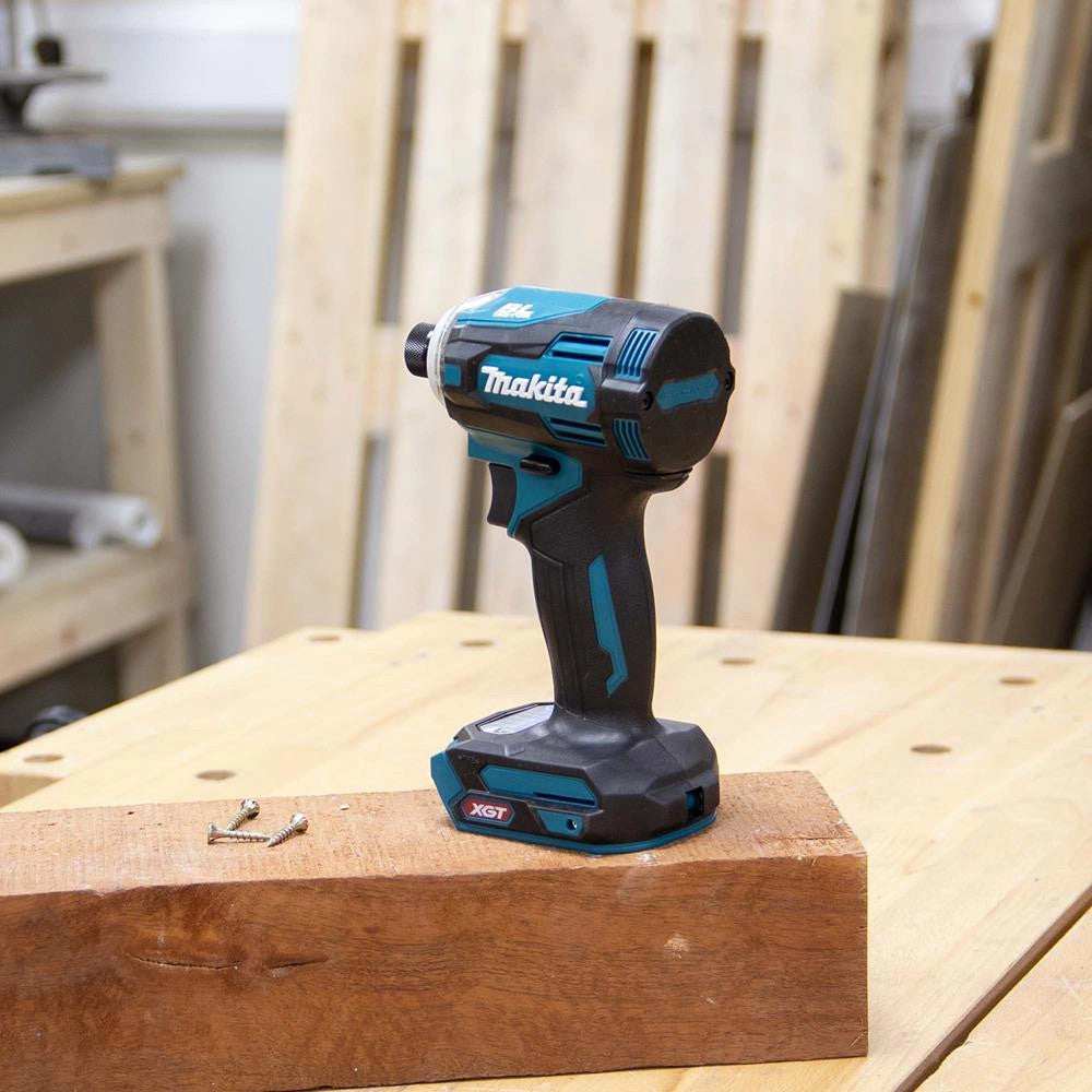 The Makita TD002GZ04 is a 40V Max XGT brushless 1/4" impact driver designed for high performance and durability. It features an ergonomically designed handle with a soft grip for increased comfort, an electric brake for productivity and safety, and Extreme Protection Technology (XPT) for enhanced dust and water resistance. The impact driver has a variable no-load speed range of 0 - 3700 min⁻¹ and delivers a maximum fastening torque of 220 Nm. It includes a brushless motor for maintenance-free operation and a battery protection circuit to prevent overloading and overheating.
