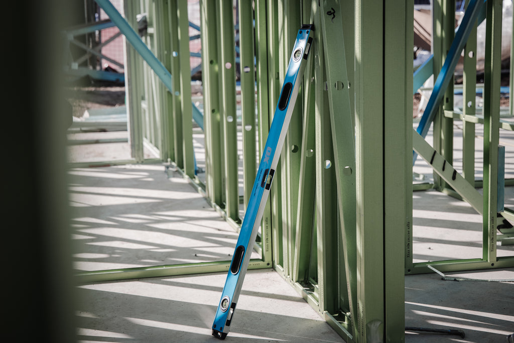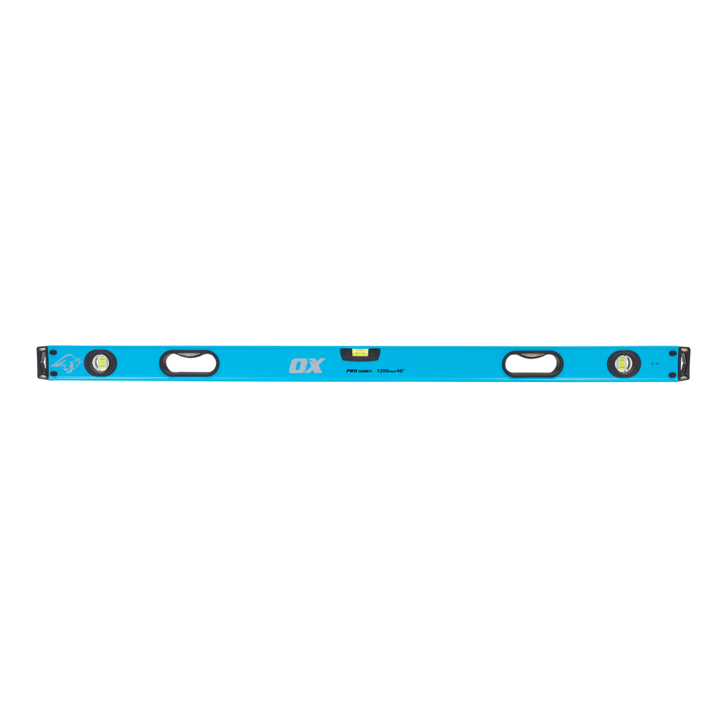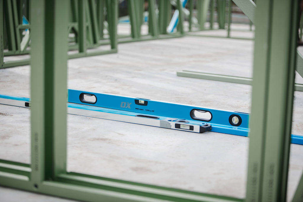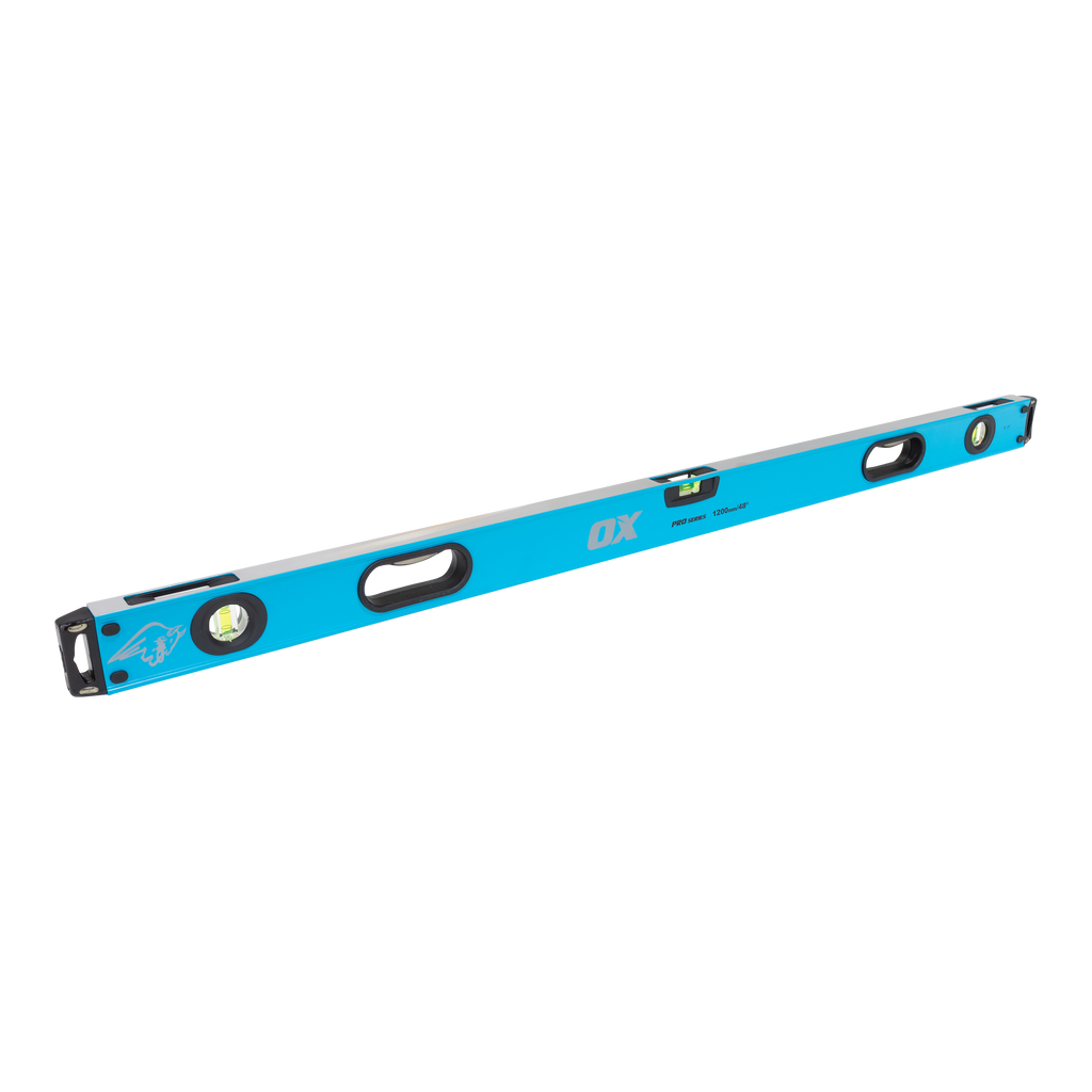 The incredibly strong OX Pro Level 1200mm features unique highly accurate, UV resistant and magnified dual Easy View vials which are backed by a lifetime ‘Vial Warranty’. The strong aluminium profile is fine milled on top and bottom edges for 100% precision. Features easy-to-hold silicone air cushioned handles and perfectly positioned rubber studs to provide scratch protection when pressing against a wall as well as extra grip to the surface. Shock resistant end caps protect against drops and bumps on site.
