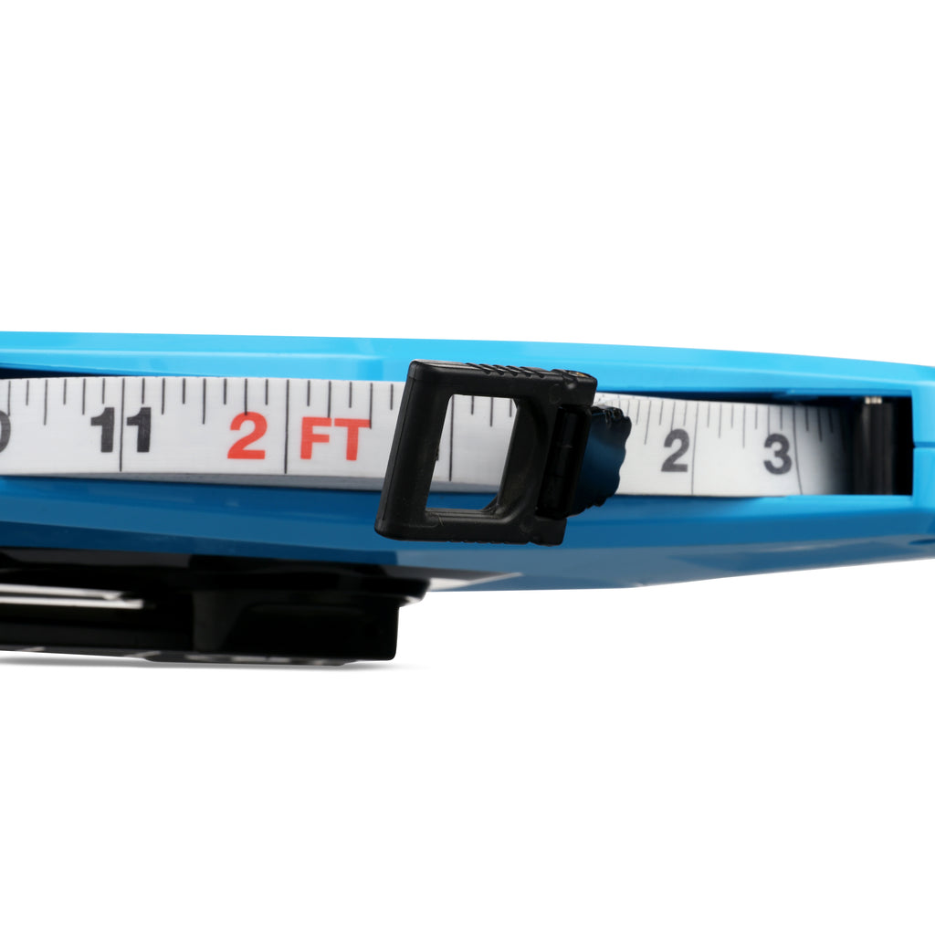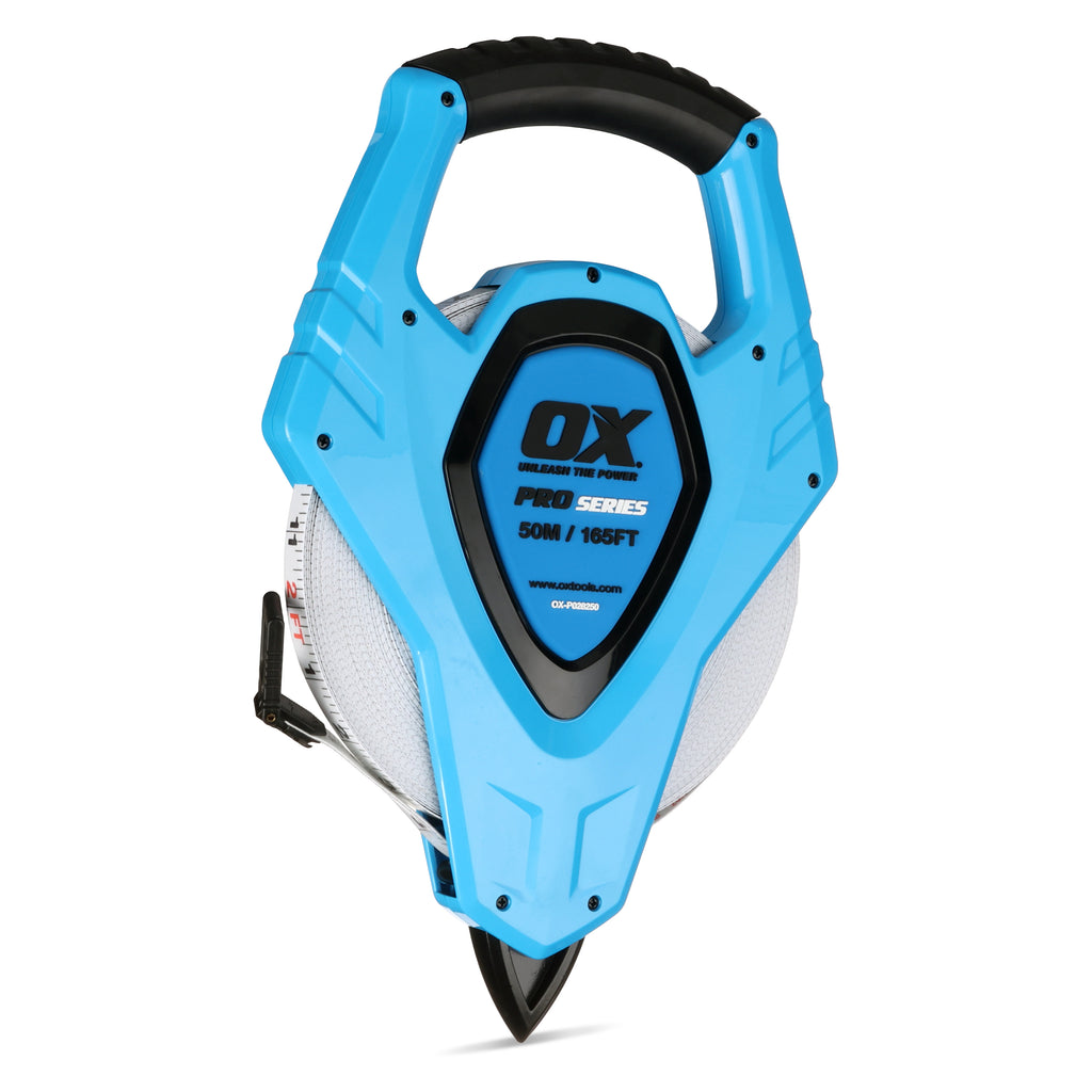 The OX Pro 50M/ 165FT Open Reel Tape Measure features a professional 3:1 geared closed reel with metric/imperial 30M double nylon coated fibreglass tape housed in a heavy-duty casing. An ergonomically designed rubber grip handle ensures comfort during use.