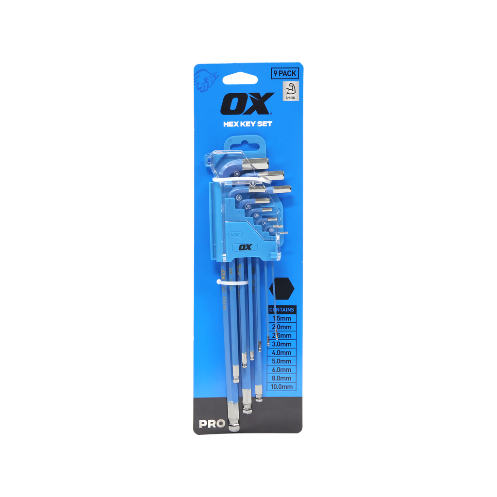 The OX Pro Hex Allen Key Long 9pc Set is built for precision and durability. Featuring a ballpoint tip, it allows a wider range of access to bolt heads, making it ideal for tight spaces. Made from tough S2 steel, this set is engineered to withstand heavy use. A protective coating ensures both the tools and your work surfaces stay in top condition. Choose OX for professional quality.