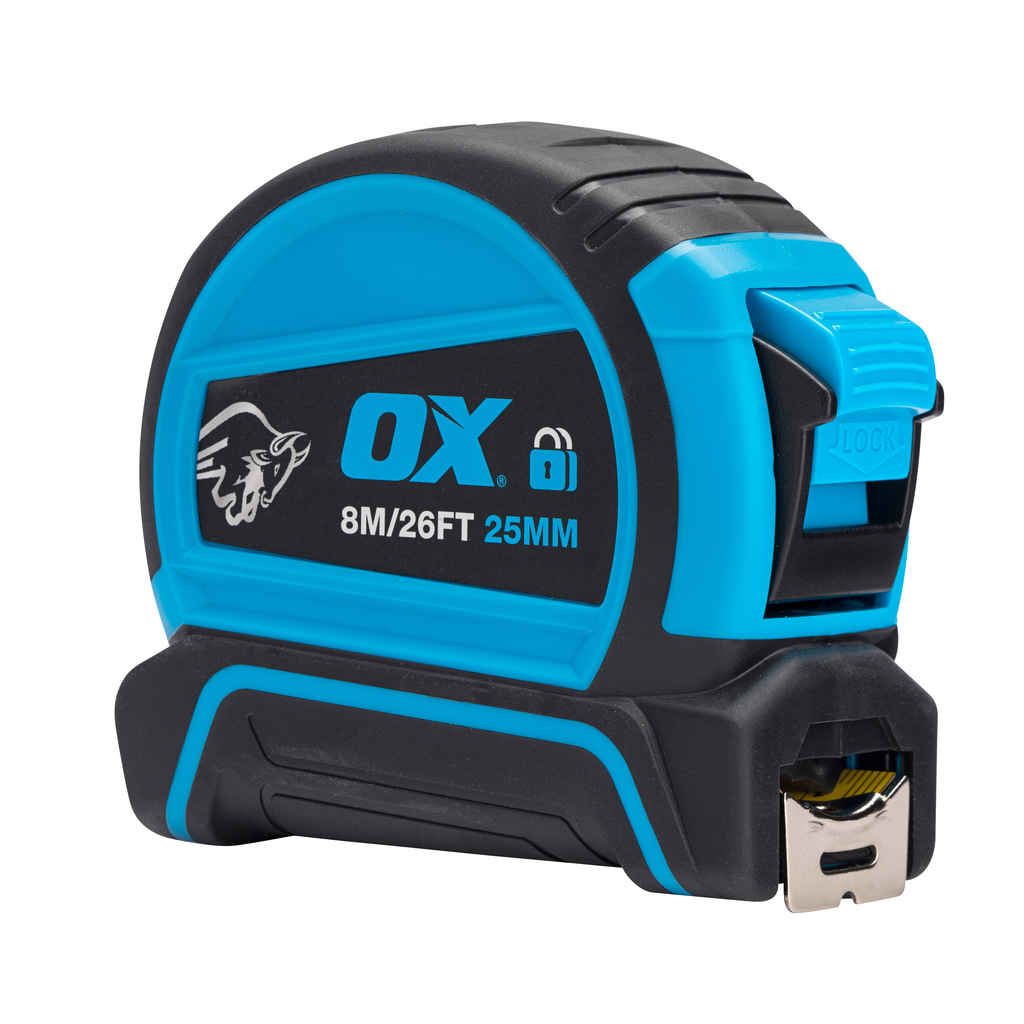 The TWINPACK OX Pro 8M Dual Auto Lock Tape Measure is designed to offer greater flexibility with its patented lock stop and go mechanism. The nylon blade features metric and imperial markings and longer life while the double-sided measurements assist when working at awkward angles. The durable and compact shell provides excellent shock protection and includes a handy belt clip.