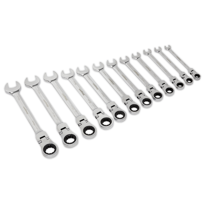 Chrome Vanadium steel flexi-head ratchet combination spanner set. 72-Tooth, ratchet ring and gear set requiring only 5° rotation to pick up the next tooth, ideal for applications where space is limited. Supplied in storage/carry rack.