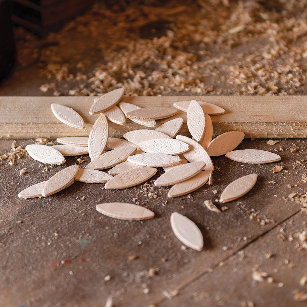 Forms accurate, high strength joints in soft or hard woods, plywood, composition boards and other timber. Much faster and more precise than dowelling. The biscuits are made of compressed laminated hardwood which expands upon contact with a woodworking adhesive.