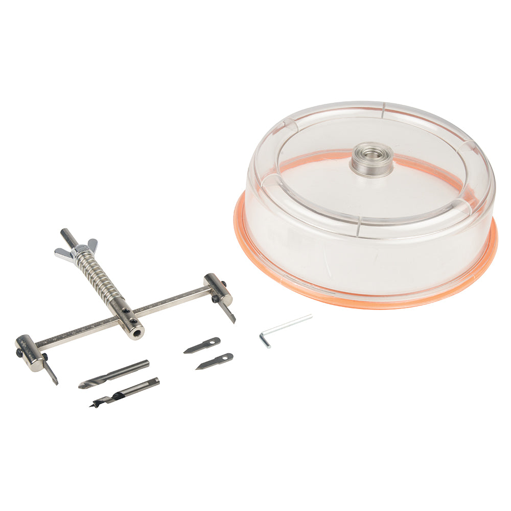 Adjustable hole cutter with dual blade design and cowling, ideal for plasterboard. Also cuts wood, plastic, aluminium, brass and acrylic. Steel cutter arms with diameter graduations at 5mm intervals. Safety cowl reduces risk of injury from flying particles and makes clean-up easier. Ideal for making holes for electrical fittings, pipes and vents. For use with a power drill or hand brace. Max speed 500rpm. Includes 1 x hex key, 2 x TCT blades, 2 x carbon steel blades, 1 x auger drill bit and 1 x TCT masonry drill bit.