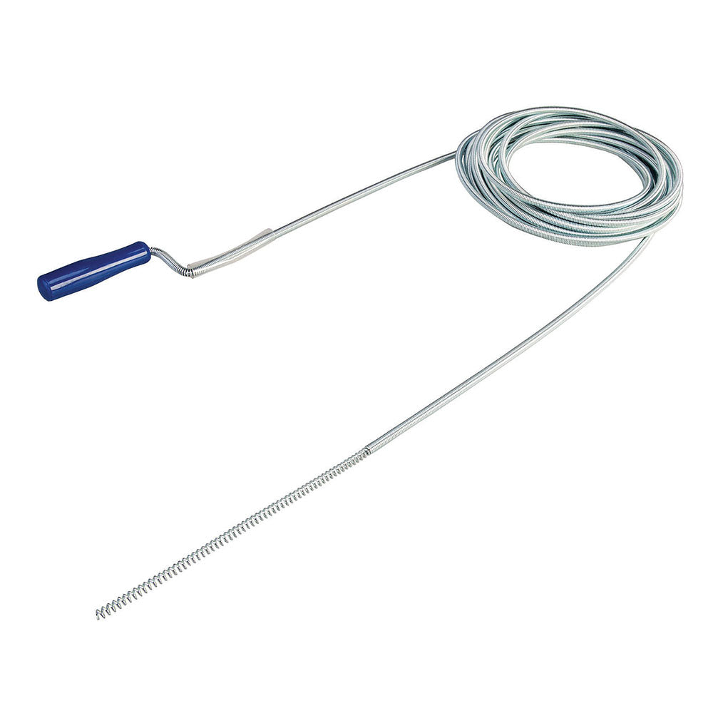 Spring wire drain cleaner with corkscrew probe and plastic handle. Unblocks drains and clears waste pipes. Ideal for clearing debris and fat residue from sink drains, traps and waste pipes. Spring diameter: 9mm.