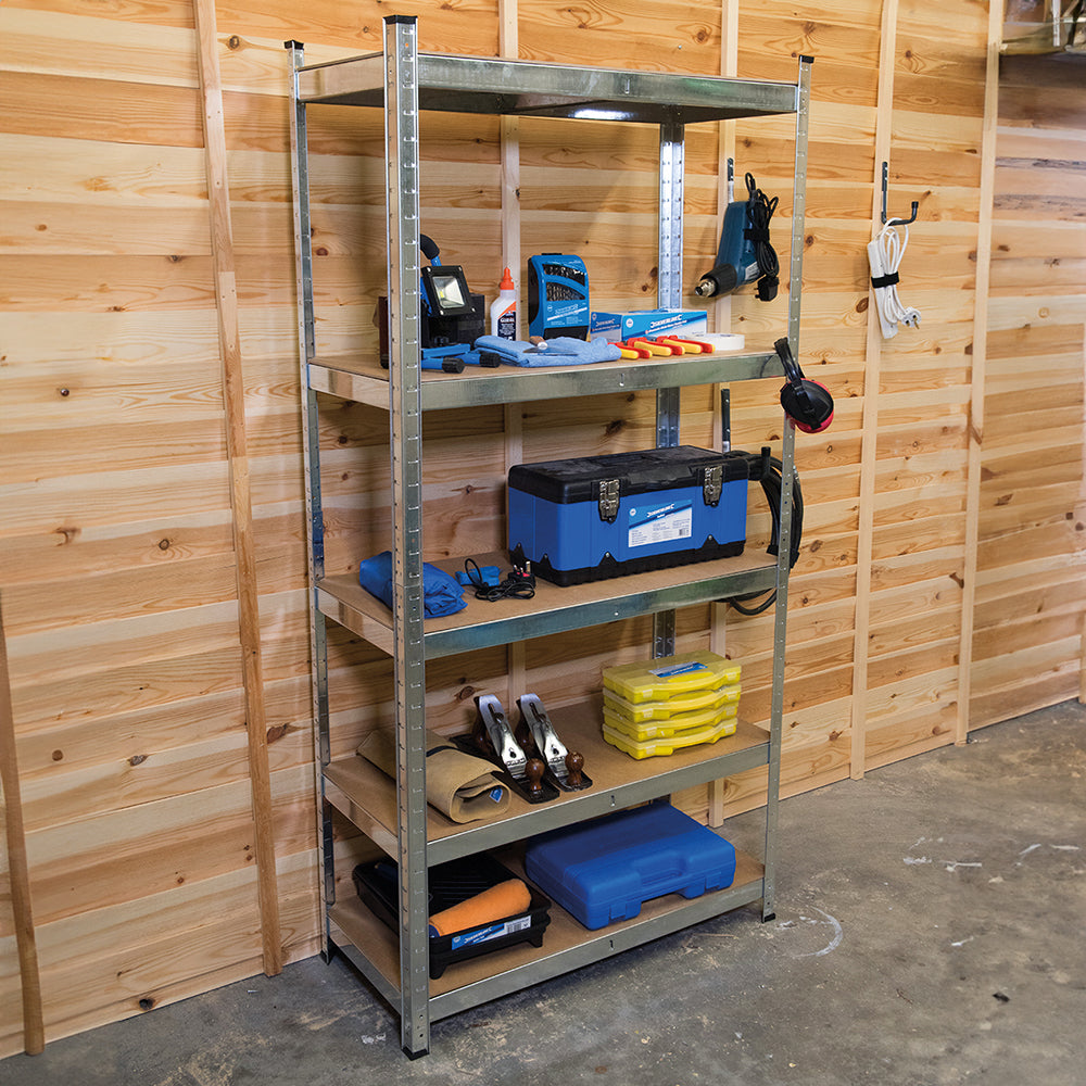 Galvanised steel frame with 5 x MDF shelves. 175kg per shelf capacity. Two-piece uprights allow use as a single bay rack. Can also be split into two separate shelf systems or workstations. Plastic feet included. Size 1800 x 900 x 400mm.