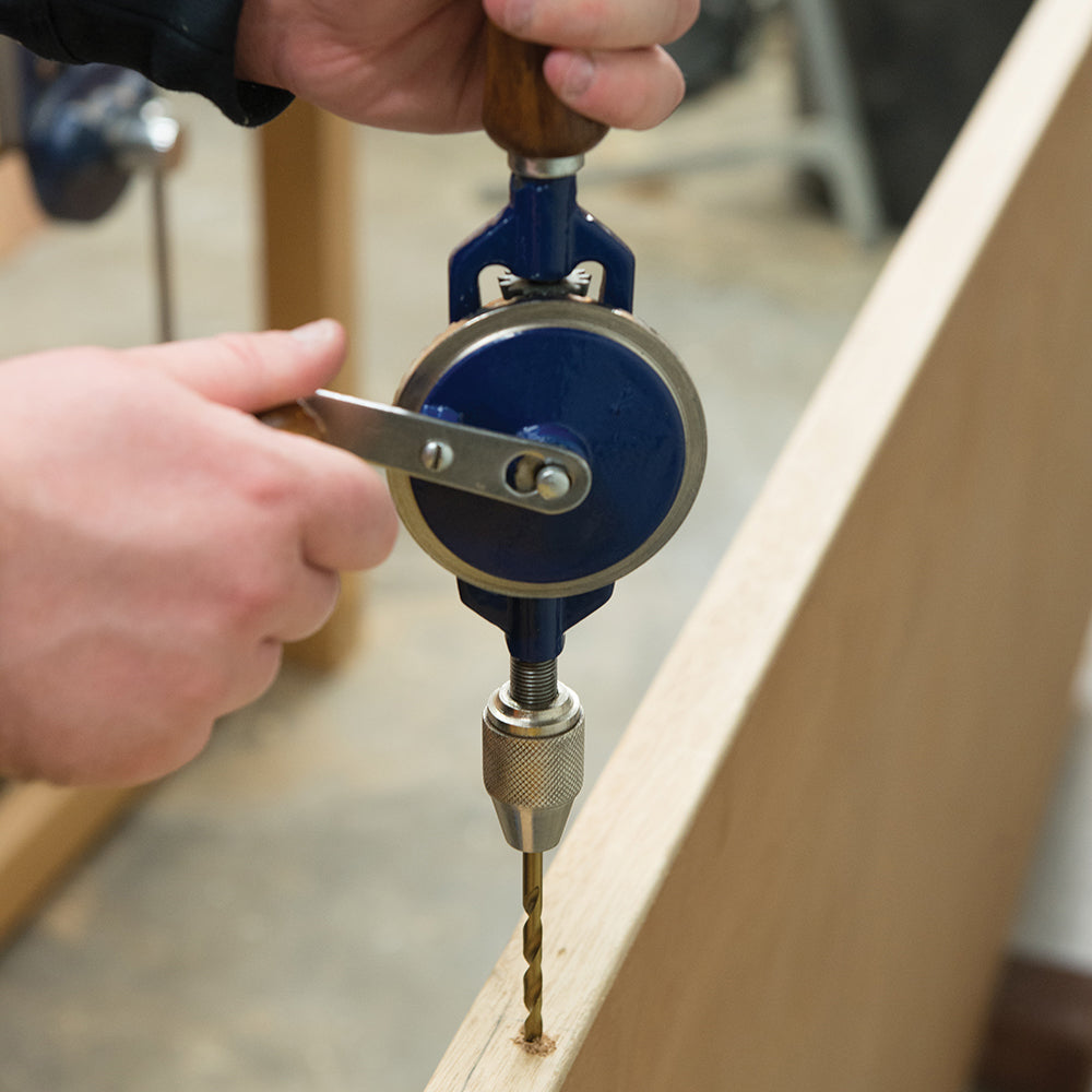 Hardwood handles and double-pinion, milled gears for smoother running. Fitted with 6mm, 3-jaw, hand-tightened chuck.
