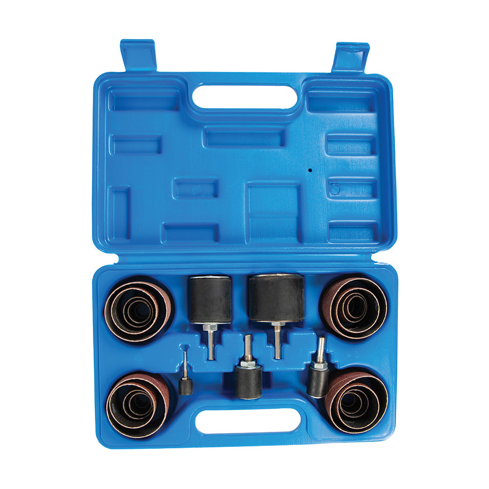 5 Sizes; 13, 19, 25, 38 and 50mm. 20 sanding sleeves supplied (4 of each size), rubber drum spindles (1 of each size). For use with power drills. Includes carry case.