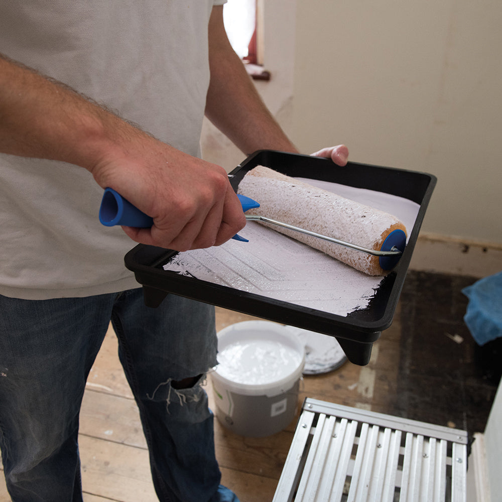 Medium-pile sleeve for use with oil and water-based emulsion paints. Polypropylene tray with textured base for even paint loading. Compatible with tapered extension poles, including Silverline 633699.