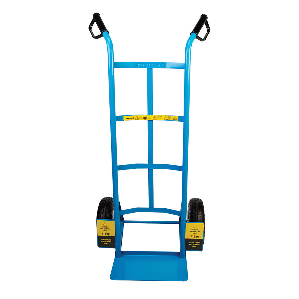 Durable, heavy duty box sack truck for tough, daily use in warehouses, offices and domestic applications. Robust tubular frame, quality welded joints and powder-coated rust and chip-resistant finish. Large toe plate for easy loading. Pneumatic all-terrain wheels with steel guards for a variety of terrains. Superior, maintenance-free, sealed ball bearings ensure smooth, quiet rotation of the wheels. Overall height 1140mm. Toe plate 350 x 190mm. Max capacity 315kg. Max tyre pressure 30psi.