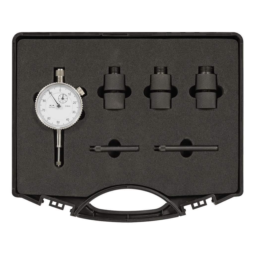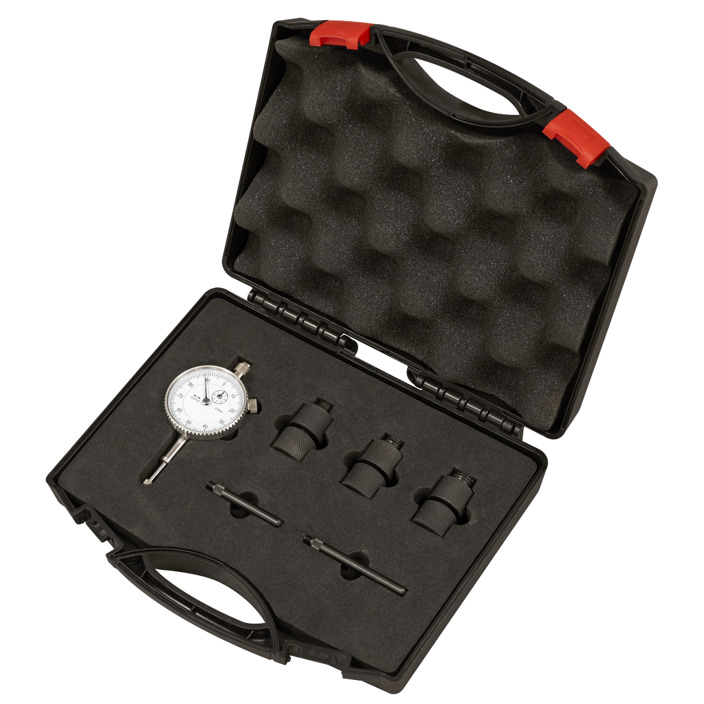 Precision mechanism with Ø41mm dial and locking rotating bezel, offering an accurate method of measuring TDC. Ideal, primarily, for motorcycle engine timing but also automotive applications and general purpose workshop use. Will indicate the travel up to 10mm with an accuracy of 0.01mm. Supplied in a storage case with spark plug adaptors and extensions in a high density foam inlay.