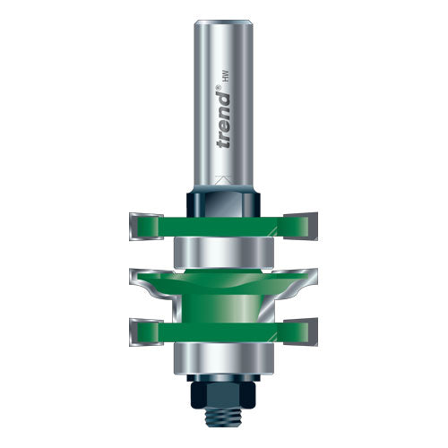 Router table use only. 1/4 inch and 8mm shanks should only be used with a medium or heavy duty router. For certain routers the aperture in the base may need to be enlarged. A workholding device should be used when cutting the scribe cut on the rail ends. The cutting edges should be staggered to each other. When using Easyset cutters take several passes.