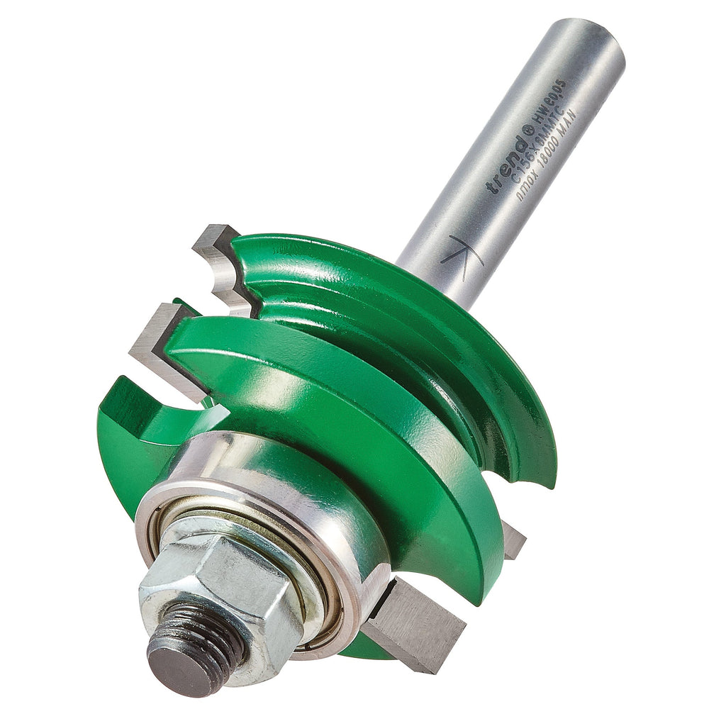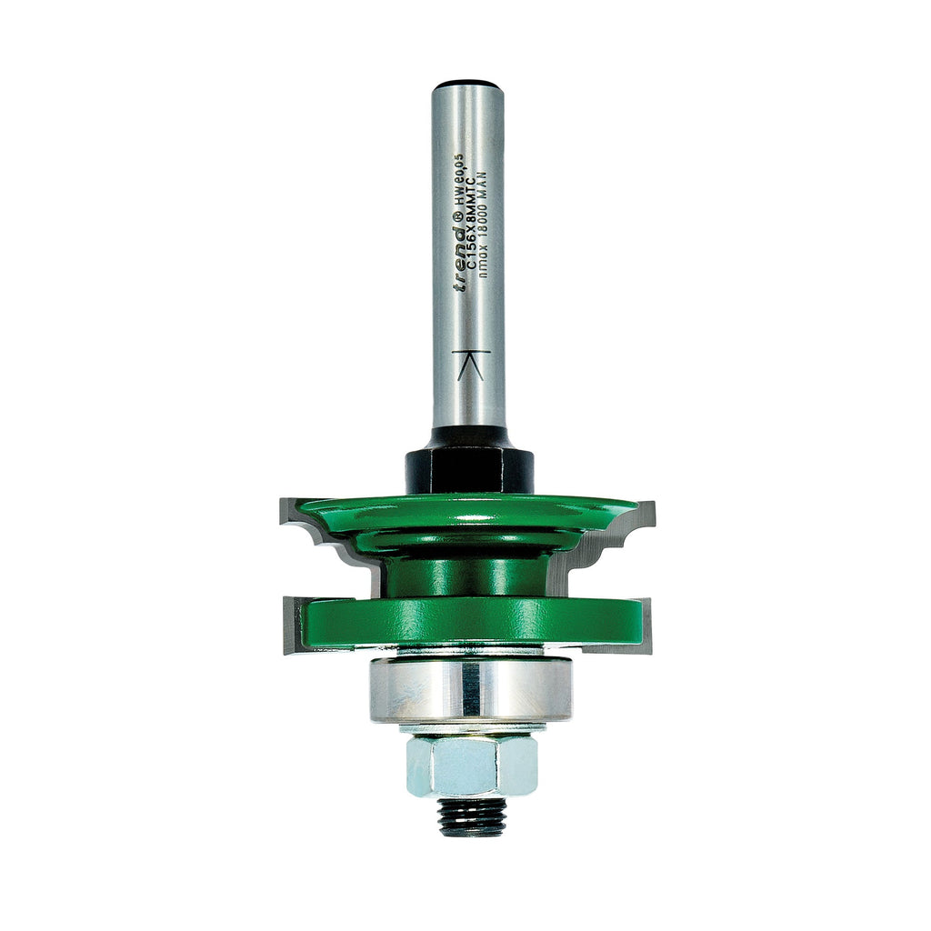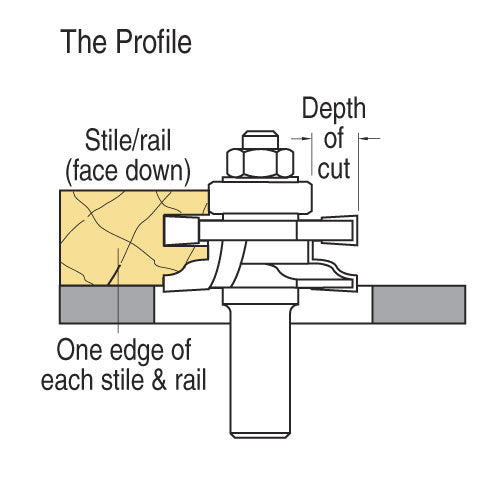 Router table use only. 1/4 inch and 8mm shanks should only be used with a medium or heavy duty router. For certain routers the aperture in the base may need to be enlarged. A workholding device should be used when cutting the scribe cut on the rail ends. The cutting edges should be staggered to each other.