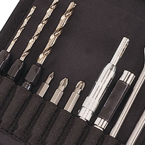 60 elasticated loop positions for holding any combination of accessory from 25mm long driver bits through to longer shanked accessories including flat bits, augers, countersinks and more.