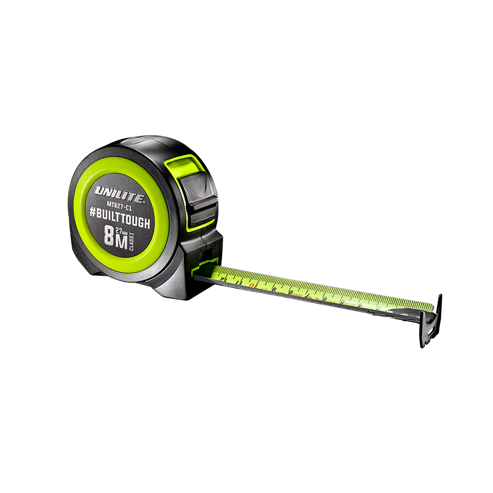 The MT827-C1 is a high quality class 1, 8 metre tape measure. Its strong blade is 27mm and is double sided with both imperial and metric. At the end of the blade is a triple riveted black carbon steel dual hook. A powerful push lock secures the blade into position and there is also a convenient finger stop on the bottom, so that you can temporarily stop the blade.