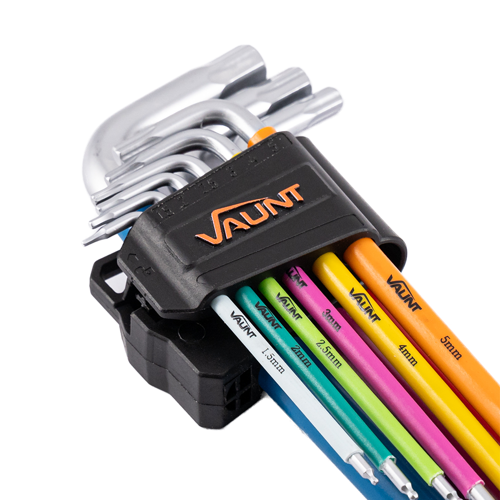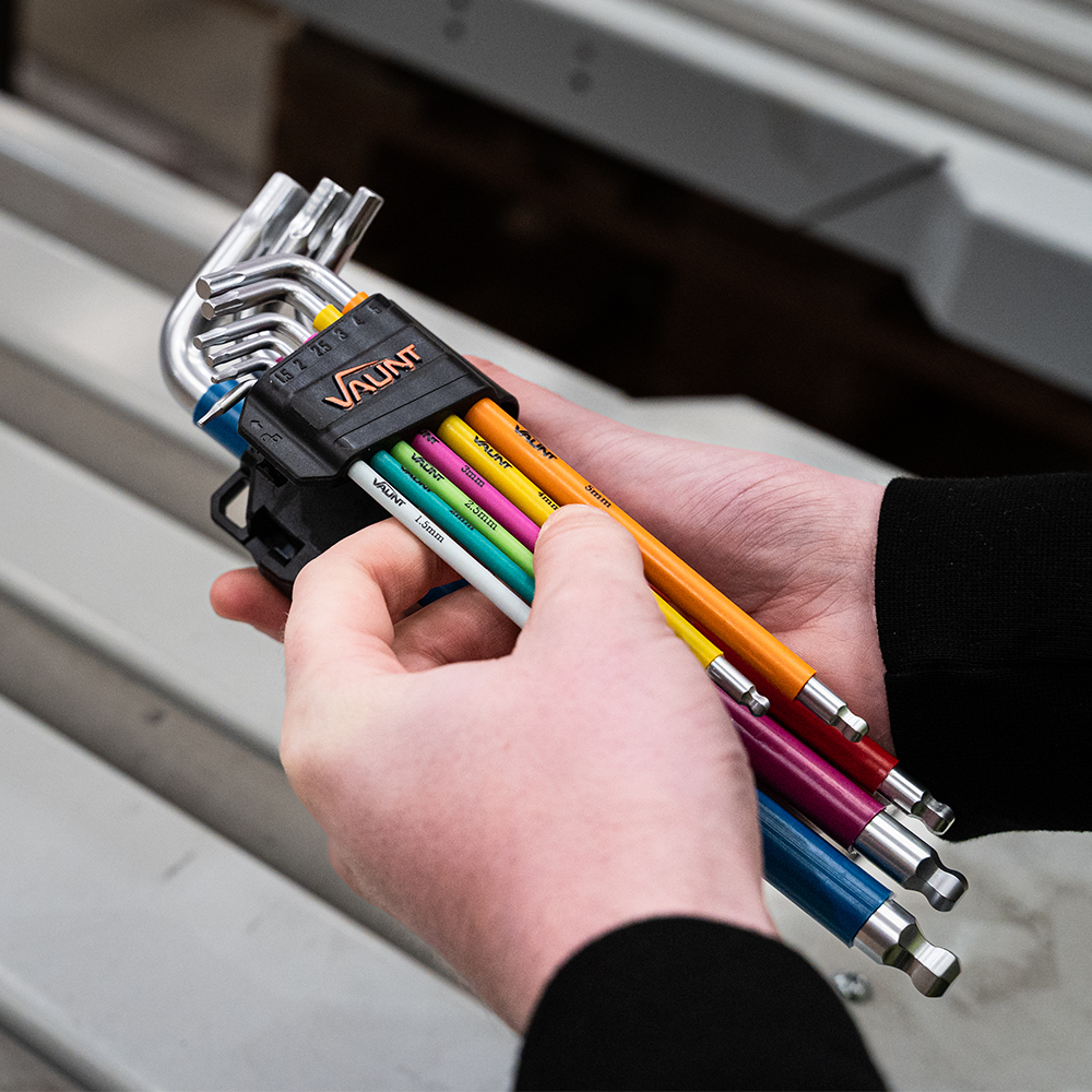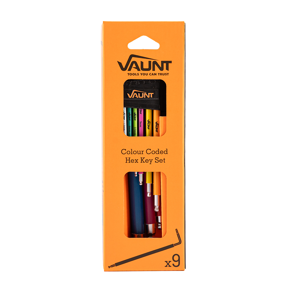 The Vaunt 9 Piece Colour Coded Ball-End Hex Key Set is designed for tightening and loosening fasteners in tight or hard-to-reach spaces. Featuring a colour-coded identification system and ball-end design, this set allows for faster, more efficient work across a wide range of applications.