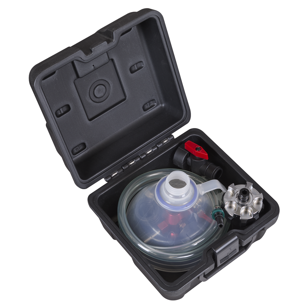 Eliminates the introduction of bubbles and airlocks into the cooling system and dramatically reduces system filling time. No more time-consuming cooling system bleeding and messy spills to clean up. Automatically conducts system leak test. Simple operation requires a workshop air supply and does not require a fiddly interchange of vacuum and fluid hoses. Refill the system by attaching the filler hose and opening the valve allowing your premixed coolant to flow into the system. The system can be filled manually via the funnel, which has a built-in shut-off valve that helps prevent airlocks. Supplied with a 1.25m filler hose, six reservoir adaptors 31, 35, 40, 42, 45mm, a cone adaptor and a storage case.
