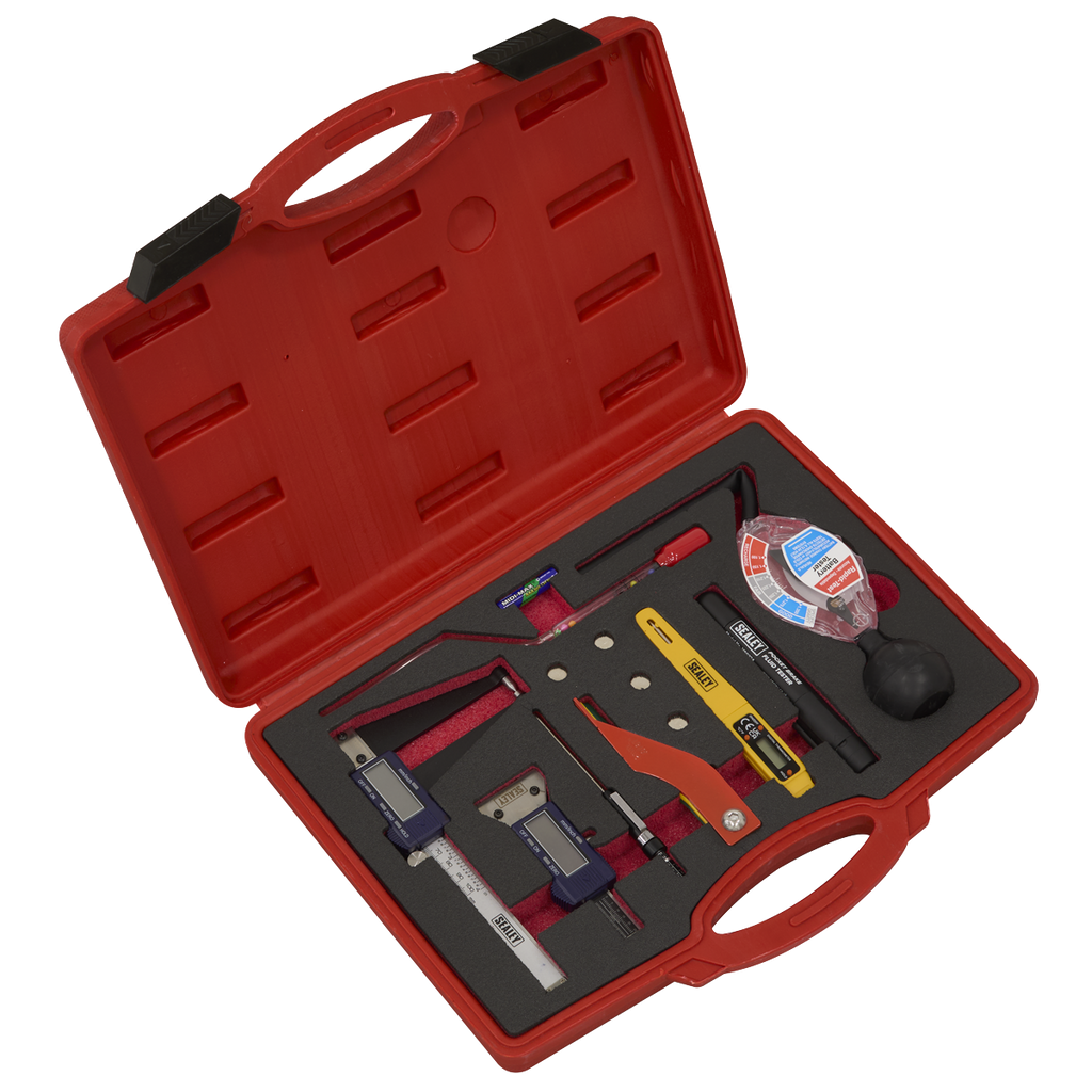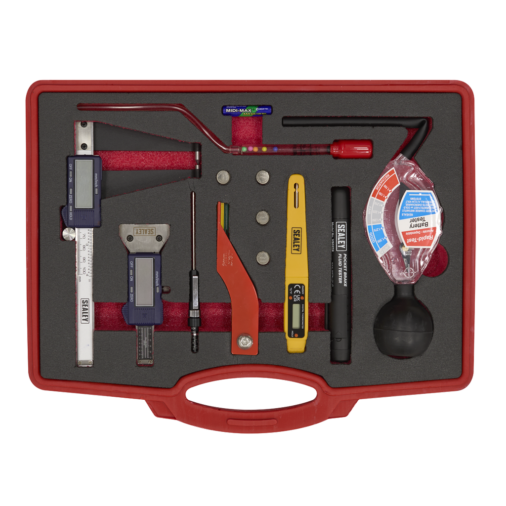 Contains essential tools for carrying out vehicle health checks. Suitable for checking brake pad and disc wear, brake fluid quality, tyre tread depth, antifreeze quality, air con temperature. Consists of Sealey Model No's AK410, AK4123, VS0274, VS0560, VS0561, VS059, VS058, VS906, refer to individual model numbers for full specification. Supplied in storage case with removable EVA foam insert.