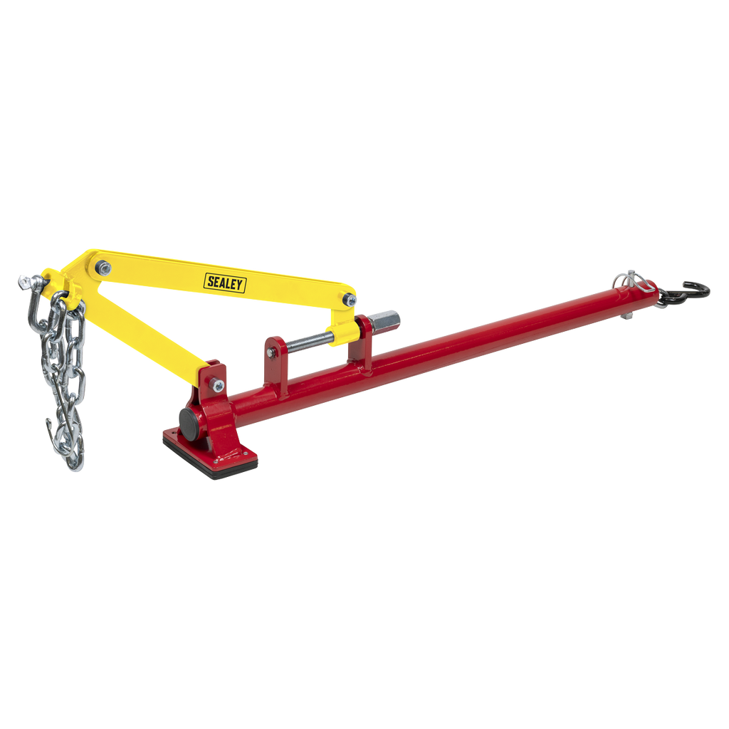 Designed to pull and hold down the lower suspension arm to allow for separation of the hub from the lower arms, lower ball joints or suspension struts from the hub. Hands-free design allowing for safer and easier operation. Prevents damage to the ball joints and drive shaft sleeves. Adjustable clamping from 65-265mm to suit multiple applications. Includes 600mm chain and hook. Manufactured from robust steel for strength and durability. Suitable for use on cars and light commercial vehicles.