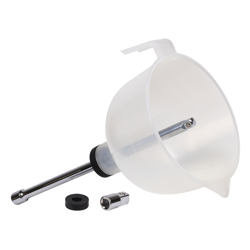 Designed to capture oil spillage when removing oil filters. The long reach extension bar and oil seal contain waste oil. The pouring spout makes waste oil disposal easy. Spill-proof oil filter removal. Protects the technician's hands from hot oil during the oil filter removal process. Oil funnel capacity: 1L. 300mm 3/8ÓSq Drive extension bar that connects to any oil filter wrench (wrench not included). The set also includes a 3/8Ó to 1/2Ó Adaptor.